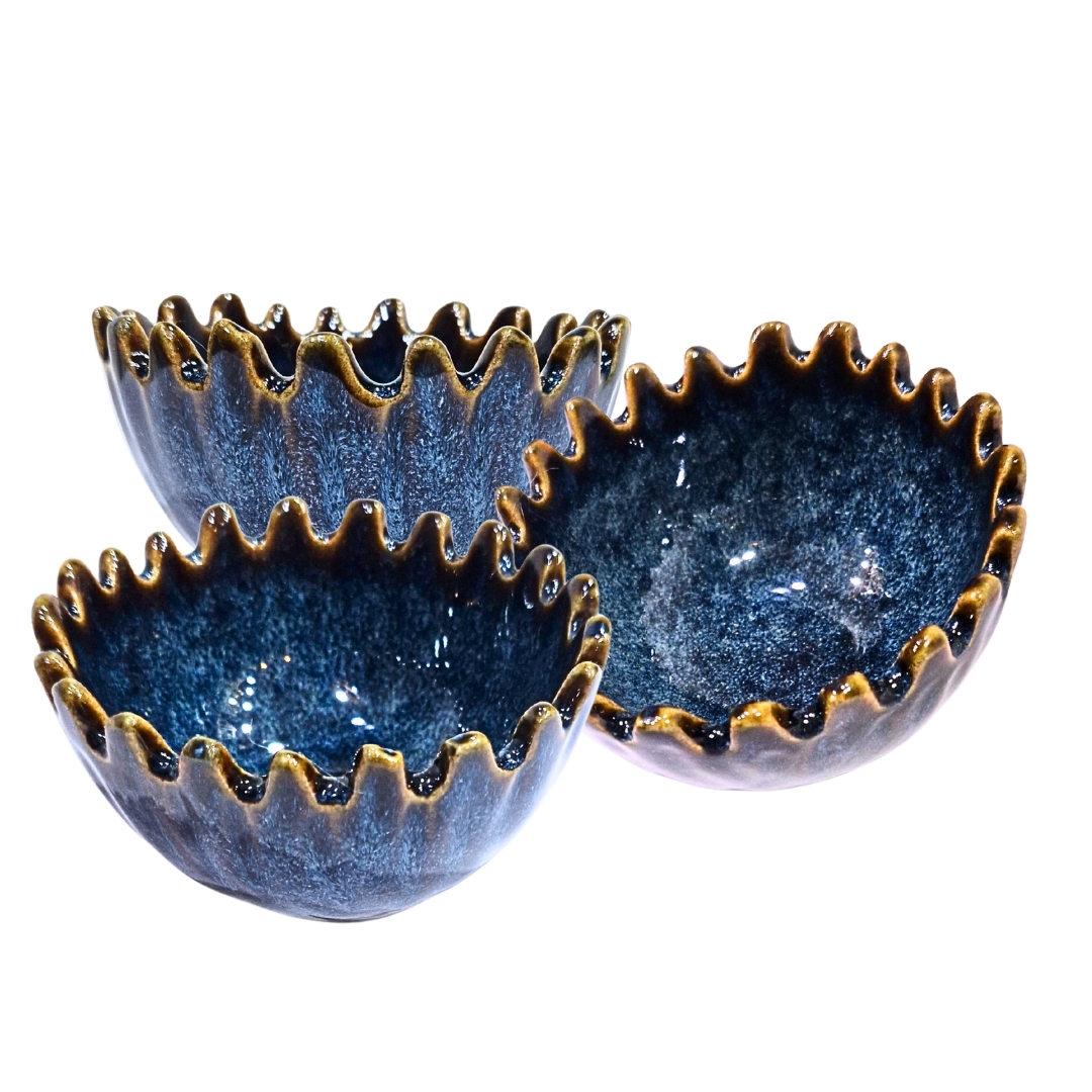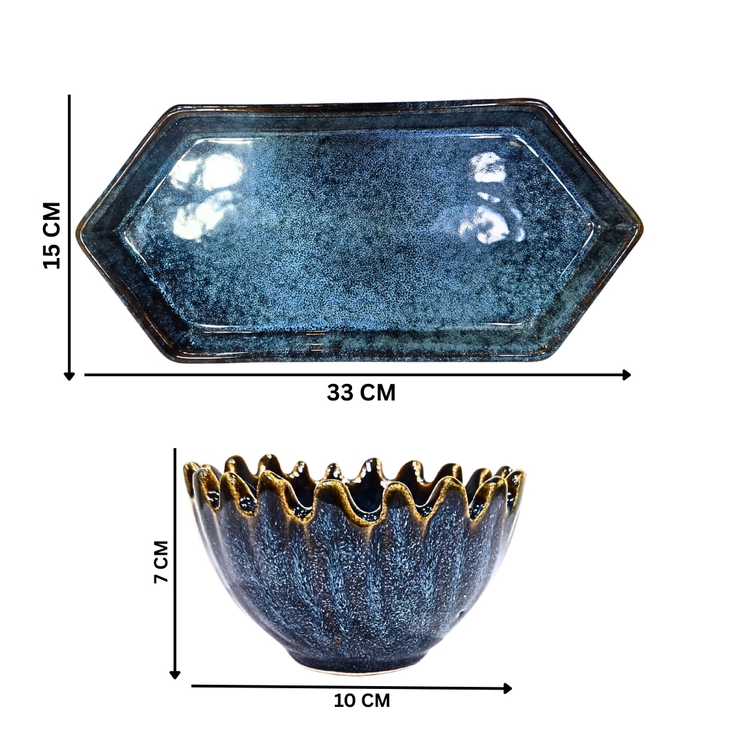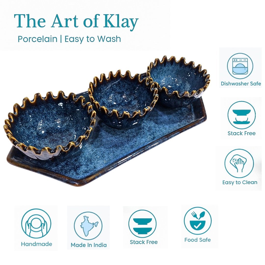 Elevate dining with The ART of KLAY’s handcrafted ceramic bowl set. Featuring three 4-inch serving bowls and a 13-inch tray in vibrant blue, this versatile set is perfect for snacks, soups, or cereals. Microwave safe, durable, and handmade in India, it blends elegance with practicality for every occasion.
