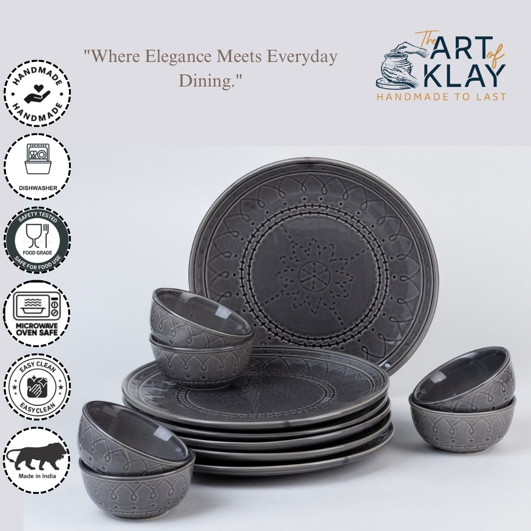 Introducing The ART of KLAY Handcrafted Ceramic Dinner Set, a 20-piece masterpiece of elegance and durability. Featuring dinner plates, quarter plates, bowls, and serving bowls, each hand-glazed piece is cadmium-free, lead-free, microwave, dishwasher, and freezer safe. Fired at 1400°C, this timeless dinnerware elevates everyday meals and special occasions.